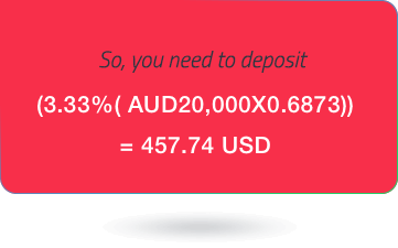 You decide to buy AUD 20,000 worth of USD because you think that the AUD/USD price will rise in the future. Your account leverage is set to 30:1. This means that you need to deposit 3.33% of the total position value into your margin account.